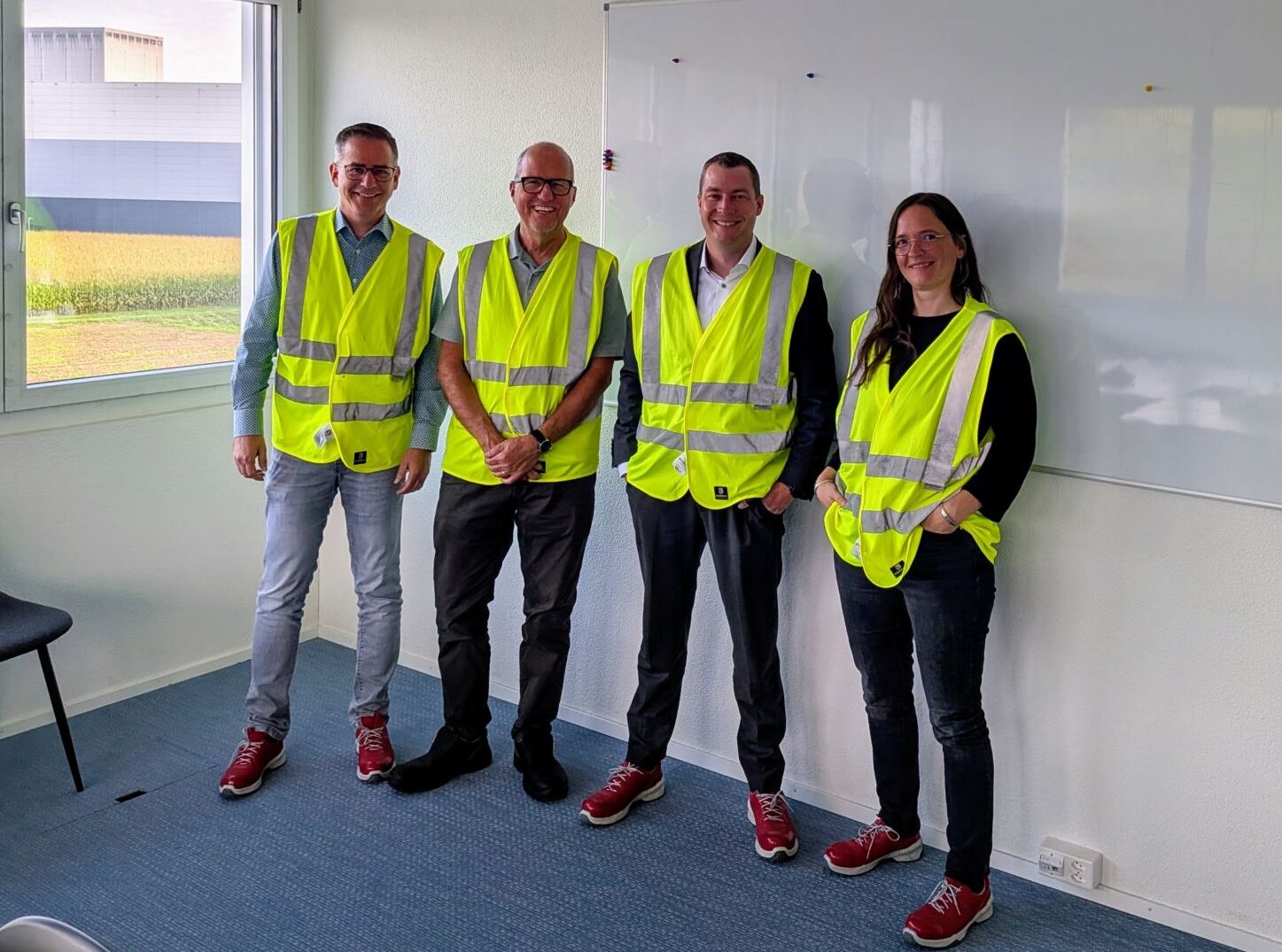 P.S.: Und ja, wir haben während der ganzen Verwaltungsratssitzung unsere Besucher-Leuchtweste und die Sicherheitsschuhe getragen. Auf dem Foto v.l.n.r.: Stefan Christen, Daniel Aeberhard, Marcel Gertsch und Linda Stucki.